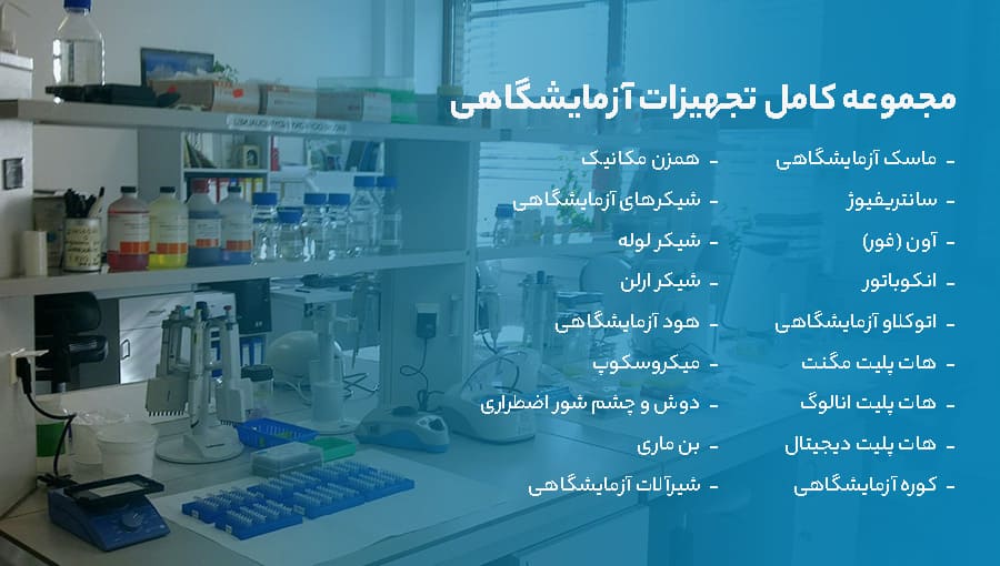 تجهیزات آزمایشگاهی مجموعه ای از دستگاه و وسایل آزمایشگاهی است که وجود آن ها در آزمایشگاه برای محققین بسیار اهمیت دارد زیرا برای انجام آزمایشات، تحقیق و پژوهش کاربرد بسیار بالایی دارند. این تجهیزات با توجه به نوع آزمایشگاه متفاوت است و بر اساس نوع کاربردی که دارند شامل ابزار های ساده تا دستگاه های بسیار پیچیده می باشند. هر چقدر این تجهیزات در آزمایشگاه مدرن تر باشد نتیجه آزمایش ها دقت بیشتری خواهد داشت.